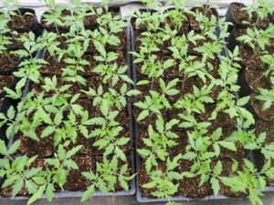 今日は、育苗ハウスの苗のチェック、桃太郎シルクのセルポスト苗120本のポットへの移植、ポットへの土入れ(ジャンプ錠入れ)、水入れ、土運び、ポット土穴あけ、サイドや妻面の開閉、不織布トンネルの外し、設置等の作業を行いました。