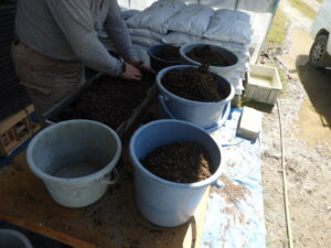 今日は、土耕の育苗ハウス2棟の準備でサイドの下張りをつけたり、ポット土のポッターによる土詰め(ジャンプ錠入れ)、ポット土への水入れ、動噴のホースの準備、土運び等の作業を行いました。